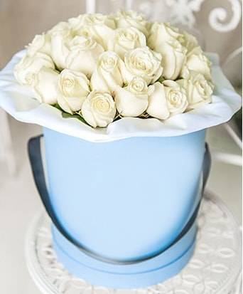 Белые цветы издавна обозначают доброе отношение, светлые чувства, нежность, чистоту и гармонию. А розы этого цвета – лучшие цветы, подходящие ребенку в честь Дня Рождения, возлюбленной на свидание или годовщину и невесте на свадьбу. Цветочная композиция в стильной голубой коробке смотрится органично, а добавление зелени обеспечивает естественность и натуральность. Запах роз улучшает настроение дарит позитив, оставляя навсегда отпечаток в памяти.